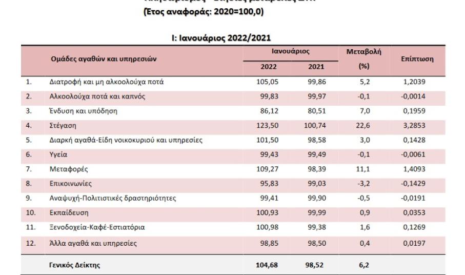 Η αύξηση του Γενικού ΔΤΚ κατά 6,2% τον μήνα Ιανουάριο 2022, σε σύγκριση με τον αντίστοιχο Δείκτη του Ιανουαρίου 2021, προήλθε κυρίως από τις μεταβολές στις ακόλουθες ομάδες αγαθών και υπηρεσιών: