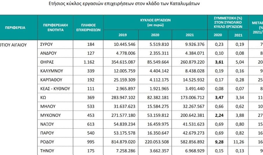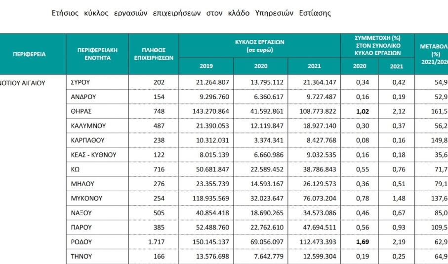 Στο σύνολο των επιχειρήσεων του κλάδου παροχής καταλυμάτων, ο κύκλος εργασιών το έτος 2021 ανήλθε σε 5.176.144.589 ευρώ, σημειώνοντας αύξηση 118,3% σε σχέση με το έτος 2020, όπου είχε ανέλθει σε 2.371.365.548 ευρώ. Για τις επιχειρήσεις των Περιφερειακών Ενοτήτων με συνεισφορά στον συνολικό κύκλο εργασιών έτους 2020 μεγαλύτερη από 1,0%, η μεγαλύτερη αύξηση στον κύκλο εργασιών μεταξύ των ετών 2021 και 2020 παρατηρήθηκε στην Περιφερειακή Ενότητα Μυκόνου (277,4%) και η μικρότερη αύξηση (64,6%) καταγράφηκε στην Περιφέρεια Αττικής.