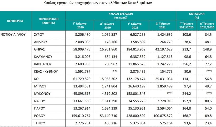 Στο σύνολο των επιχειρήσεων του κλάδου παροχής καταλυμάτων, ο κύκλος εργασιών το τέταρτο τρίμηνο 2021 ανήλθε σε 868.793.952 ευρώ, σημειώνοντας αύξηση 104,9% σε σχέση με το τέταρτο τρίμηνο 2020, όπου είχε ανέλθει σε 423.954.467 ευρώ. Για τις επιχειρήσεις των Περιφερειακών Ενοτήτων με συνεισφορά στον συνολικό κύκλο εργασιών έτους 2020 μεγαλύτερη από 1,0%, η μεγαλύτερη αύξηση στον κύκλο εργασιών το τέταρτο τρίμηνο 2021 σε σύγκριση με το τέταρτο τρίμηνο 2020 παρατηρήθηκε στην Περιφερειακή Ενότητα Ζακύνθου (210,8%) και η μικρότερη αύξηση (56,8%) καταγράφηκε στην Περιφερειακή Ενότητα Κω.