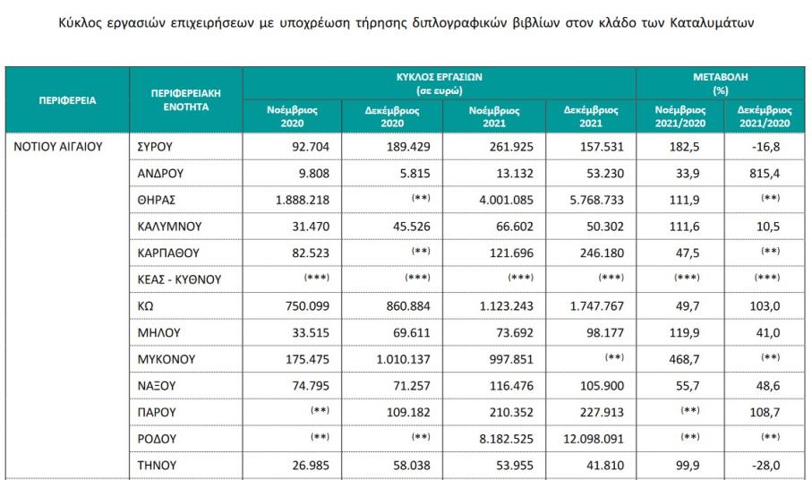 Για τις επιχειρήσεις του κλάδου καταλυμάτων με υποχρέωση τήρησης διπλογραφικών βιβλίων, για τις οποίες υπάρχουν διαθέσιμα στοιχεία σε μηνιαία βάση, ο κύκλος εργασιών τον Δεκέμβριο 2021 ανήλθε σε 151.004.501 ευρώ, σημειώνοντας αύξηση 93,9% σε σχέση με τον Δεκέμβριο 2020, όπου είχε ανέλθει σε 77.885.478 ευρώ. Για τις επιχειρήσεις των Περιφερειακών Ενοτήτων με συνεισφορά στον συνολικό κύκλο εργασιών έτους 2020 μεγαλύτερη από 1,0%, η μεγαλύτερη αύξηση στον κύκλο εργασιών τον Δεκέμβριο 2021 σε σύγκριση με τον Δεκέμβριο 2020 παρατηρήθηκε στην Περιφερειακή Ενότητα Λασιθίου (361,7%) και η μικρότερη αύξηση (69,1%) καταγράφηκε στην Περιφερειακή Ενότητα Χανίων.