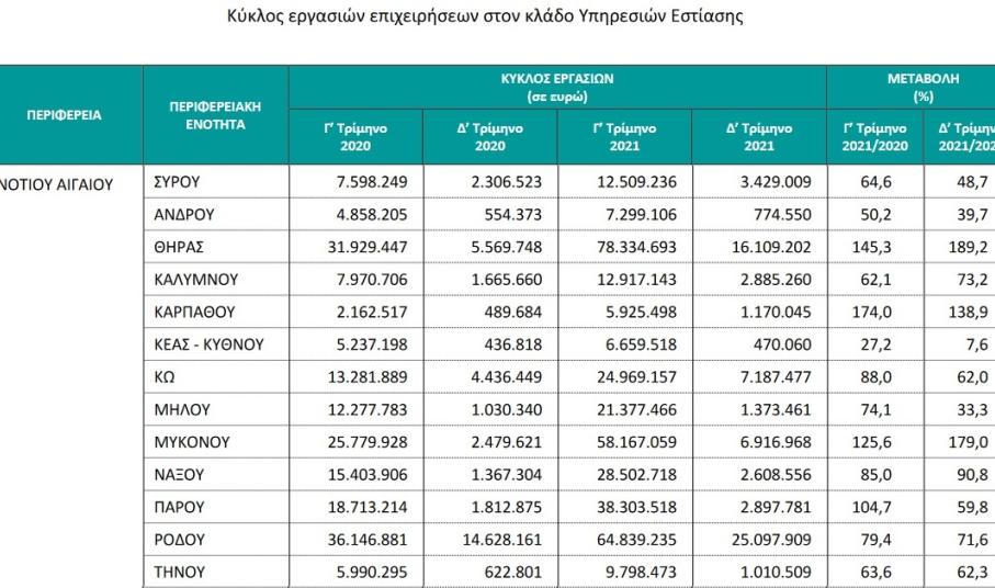 Στο σύνολο των επιχειρήσεων του κλάδου υπηρεσιών εστίασης, ο κύκλος εργασιών το τέταρτο τρίμηνο 2021 ανήλθε σε 1.320.623.995 ευρώ, σημειώνοντας αύξηση 70,0% σε σχέση με το τέταρτο τρίμηνο 2020, όπου είχε ανέλθει σε 776.795.990 ευρώ. Για τις επιχειρήσεις των Περιφερειακών Ενοτήτων με συνεισφορά στον συνολικό κύκλο εργασιών έτους 2020 μεγαλύτερη από 1,0%, η μεγαλύτερη αύξηση στον κύκλο εργασιών το τέταρτο τρίμηνο 2021 σε σύγκριση με το τέταρτο τρίμηνο 2020 παρατηρήθηκε στην Περιφερειακή Ενότητα Θήρας (189,2%) και η μικρότερη αύξηση (27,5%) καταγράφηκε στην Περιφερειακή Ενότητα Κορινθίας.