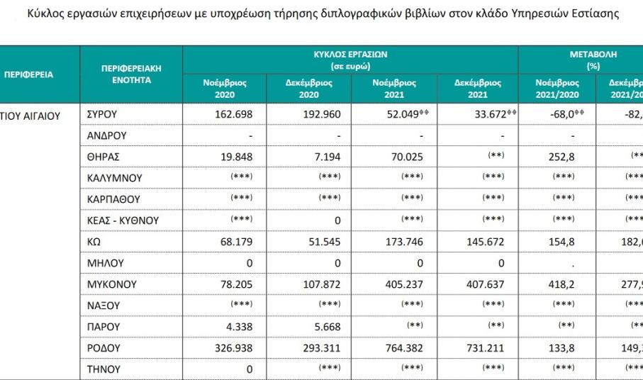 Για τις επιχειρήσεις του κλάδου υπηρεσιών εστίασης με υποχρέωση τήρησης διπλογραφικών βιβλίων, για τις οποίες υπάρχουν διαθέσιμα στοιχεία σε μηνιαία βάση, ο κύκλος εργασιών τον Δεκέμβριο 2021 ανήλθε σε 137.104.168 ευρώ, σημειώνοντας αύξηση 118,9% σε σχέση με τον Δεκέμβριο 2020, όπου είχε ανέλθει σε 62.626.204 ευρώ. Για τις επιχειρήσεις των Περιφερειακών Ενοτήτων με συνεισφορά στον συνολικό κύκλο εργασιών έτους 2020 μεγαλύτερη από 1,0%, η μεγαλύτερη αύξηση στον κύκλο εργασιών τον Δεκέμβριο 2021 σε σύγκριση με τον Δεκέμβριο 2020 παρατηρήθηκε στην Περιφερειακή Ενότητα Μαγνησίας (742,4%) και η μικρότερη αύξηση (64,7%) καταγράφηκε στην Περιφερειακή Ενότητα Ηρακλείου, ενώ μείωση (39,4%) καταγράφηκε στην Περιφερειακή Ενότητα Χαλκιδικής.