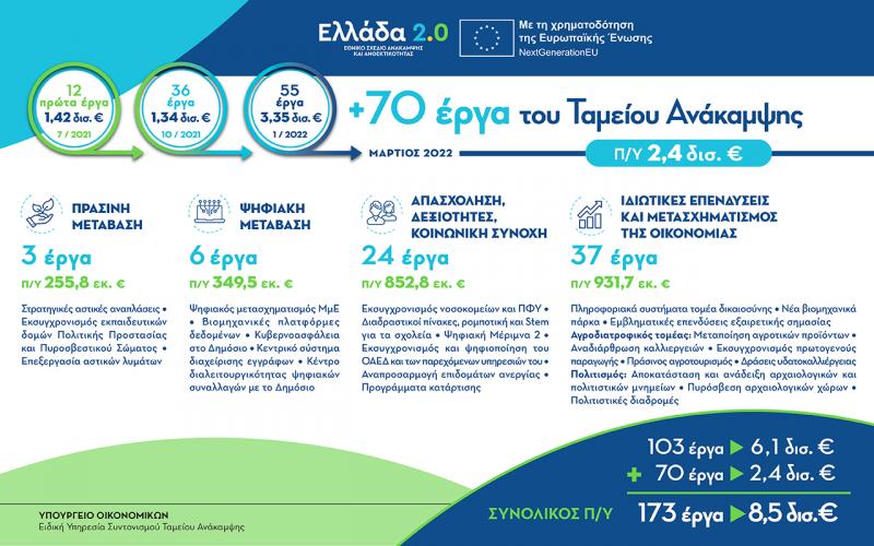 Μετά και από τις παραπάνω εντάξεις, ο συνολικός προϋπολογισμός των 173 έργων που έχουν λάβει έγκριση υλοποίησης, στο πλαίσιο του «Ελλάδα 2.0», διαμορφώνεται σε 8,5 δισ. ευρώ.