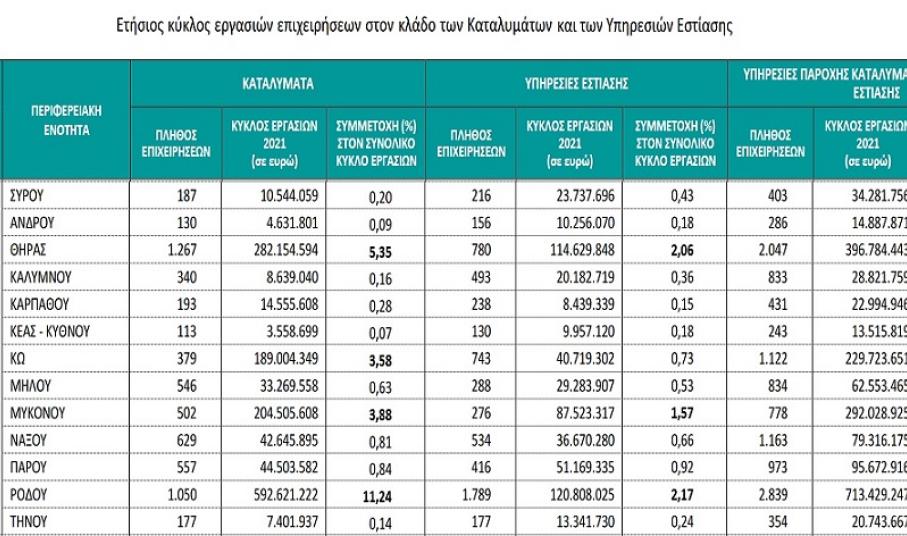 Στο σύνολο των επιχειρήσεων του κλάδου των καταλυμάτων, ο κύκλος εργασιών το πρώτο τρίμηνο 2022 ανήλθε σε 283.075.798 ευρώ, σημειώνοντας αύξηση 204,9% σε σχέση με το πρώτο τρίμηνο 2021, όπου είχε ανέλθει σε 92.855.293 ευρώ.