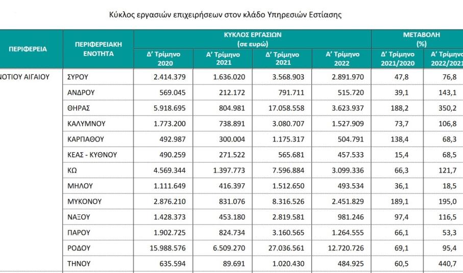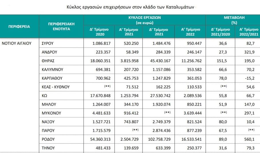 Για τις επιχειρήσεις των περιφερειακών ενοτήτων με συνεισφορά στον συνολικό κύκλο εργασιών έτους 2021 μεγαλύτερη από 1,0%, η μεγαλύτερη αύξηση στον κύκλο εργασιών το πρώτο τρίμηνο 2022 σε σύγκριση με το πρώτο τρίμηνο 2021 παρατηρήθηκε στην Περιφερειακή Ενότητα Ρόδου (560,1%) και η μικρότερη αύξηση (66,7%) καταγράφηκε στην Περιφερειακή Ενότητα Κω.