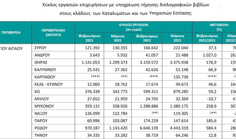 Για τις επιχειρήσεις στους κλάδους των καταλυμάτων και των υπηρεσιών εστίασης, με υποχρέωση τήρησης διπλογραφικών βιβλίων, για τις οποίες υπάρχουν διαθέσιμα στοιχεία σε μηνιαία βάση, ο κύκλος εργασιών τον Μάρτιο 2022 ανήλθε σε 215.779.976 ευρώ, σημειώνοντας αύξηση 155,3% σε σχέση με τον Μάρτιο 2021, όπου είχε ανέλθει σε 84.524.696 ευρώ.