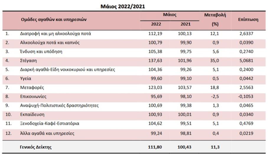 Η αύξηση του Γενικού ΔΤΚ κατά 11,3% τον μήνα Μάιο 2022, σε σύγκριση με τον αντίστοιχο δείκτη του Μαΐου 2021, προήλθε κυρίως από τις μεταβολές στις ακόλουθες ομάδες αγαθών και υπηρεσιών:
