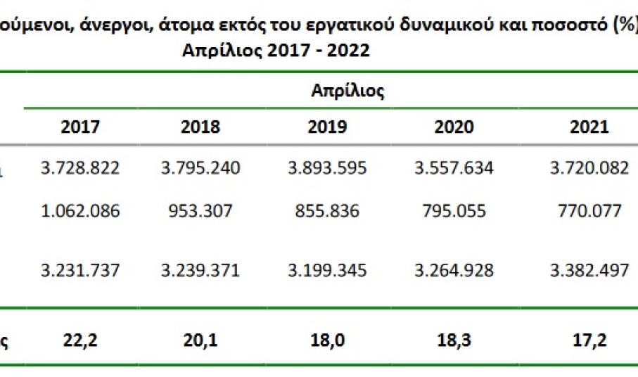 Τα άτομα κάτω των 75 ετών που δεν περιλαμβάνονται στο εργατικό δυναμικό, ή «άτομα εκτός του εργατικού δυναμικού», δηλαδή τα άτομα που δεν εργάζονται ούτε αναζητούν εργασία, ανήλθαν σε 3.125.509, σημειώνοντας μείωση κατά 256.988 άτομα σε σχέση με τον Απρίλιο του 2021 (-7,6%) και αύξηση κατά 51.662 άτομα σε σχέση με τον Μάρτιο του 2022 (+1,7%).