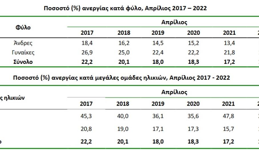 Η Ελληνική Στατιστική Αρχή (ΕΛΣΤΑΤ) ανακοινώνει τις εποχικά προσαρμοσμένες εκτιμήσεις απασχόλησης και ανεργίας για τον μήνα Απρίλιο 2022.
