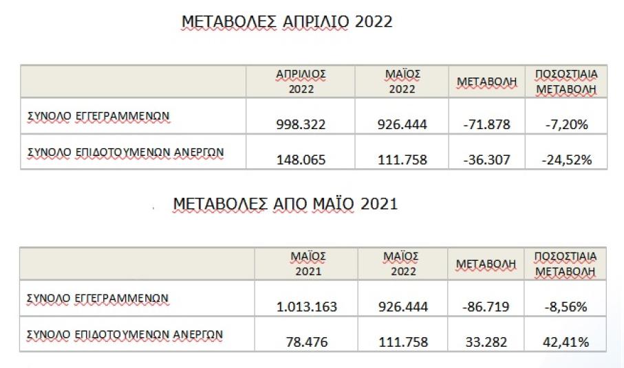 Το σύνολο των εγγεγραμμένων ανέργων, με κριτήριο την αναζήτηση εργασίας (αναζητούντων εργασία), για τον μήνα Μάιο 2022, ανήλθε σε 919.236 άτομα. Από αυτά 532.600 (ποσοστό 57,94%) είναι εγγεγραμμένα στο μητρώο της Δ.ΥΠ.Α για χρονικό διάστημα ίσο ή και περισσότερο των 12 μηνών και 386.636 (ποσοστό 42,06%) είναι εγγεγραμμένα στο μητρώο της Δ.ΥΠ.Α. για χρονικό διάστημα μικρότερο των 12 μηνών. Οι άνδρες ανέρχονται σε 318.977 (ποσοστό 34,70%) και οι γυναίκες ανέρχονται σε 600.259 (ποσοστό 65,30%).