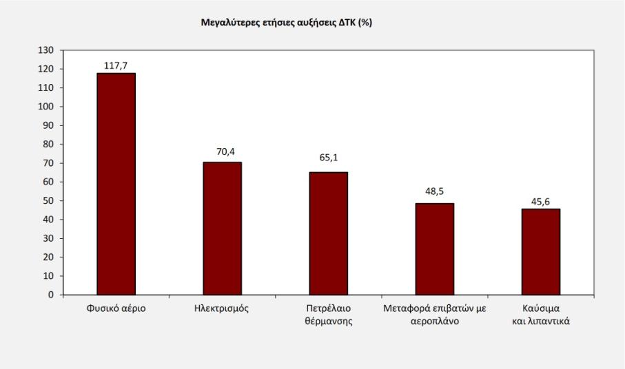 • 6,5% στην ομάδα διαρκή αγαθά-είδη νοικοκυριού και υπηρεσίες, λόγω αύξησης κυρίως των τιμών σε: έπιπλα και διακοσμητικά είδη, οικιακές συσκευές και επισκευές, υαλικά-επιτραπέζια σκεύη και σκεύη οικιακής χρήσης, είδη άμεσης κατανάλωσης νοικοκυριού, οικιακές υπηρεσίες.