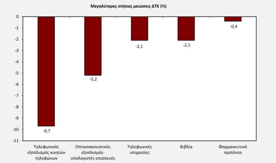 • 2,3% στην ομάδα επικοινωνίες, λόγω μείωσης κυρίως των τιμών σε: τηλεφωνικό εξοπλισμό κινητών τηλεφώνων, τηλεφωνικές υπηρεσίες.