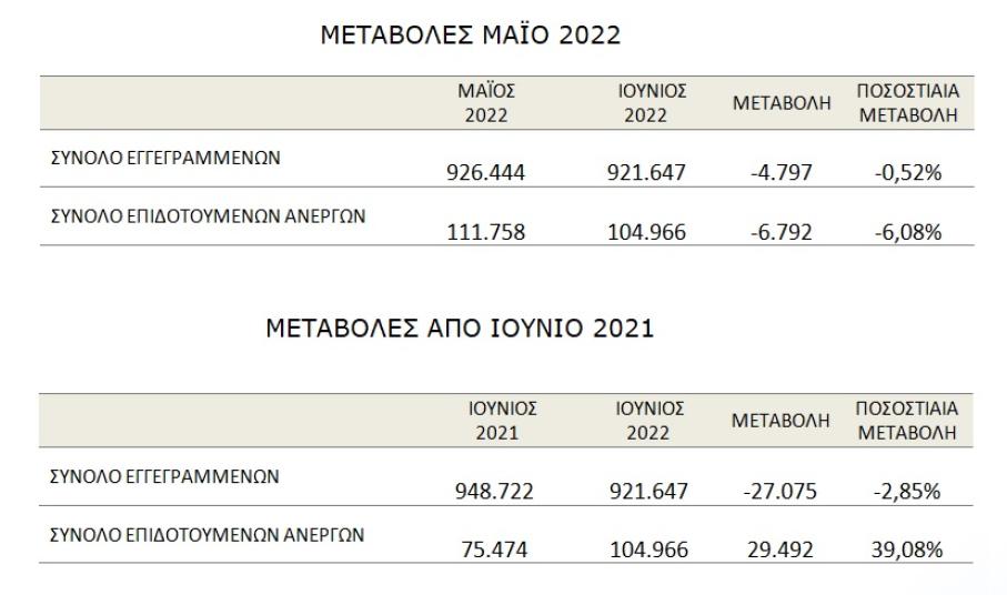 Το σύνολο των επιδοτούμενων ανέργων, για τον μήνα Ιούνιο 2022, (αφορά τον αριθμό των δικαιούχων που πληρώθηκαν εντός του αντίστοιχου μήνα) ανέρχεται σε 104.966 άτομα, από τα οποία οι 92.960 (ποσοστό 88,56%) είναι κοινοί και λοιπές κατηγορίες επιδοτουμένων και οι 12.006 (ποσοστό 11,44%) είναι εποχικοί τουριστικών επαγγελμάτων. Οι άνδρες ανέρχονται σε 45.153 (ποσοστό 43,02%) και οι γυναίκες σε 59.813 (ποσοστό 56,98%).