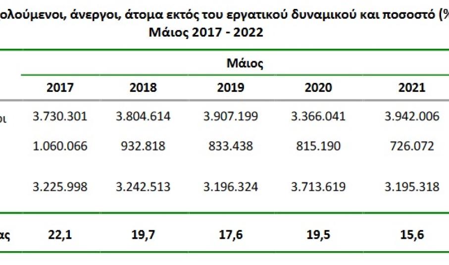 • Οι άνεργοι ανήλθαν σε 596.056 άτομα σημειώνοντας μείωση κατά 130.016 άτομα σε σχέση με τον Μάιο του 2021 (-17,9%) και αύξηση κατά 4.495 άτομα σε σχέση με τον Απρίλιο του 2022 (+0,8%).