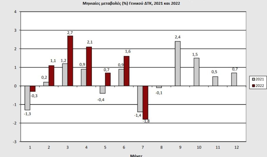 Από τη σύγκριση του Γενικού ΔΤΚ του μηνός Ιουλίου 2022 με τον αντίστοιχο Δείκτη του Ιουλίου 2021 προέκυψε αύξηση 11,6% έναντι αύξησης 1,4% που σημειώθηκε κατά την αντίστοιχη σύγκριση του έτους 2021 με το 2020.