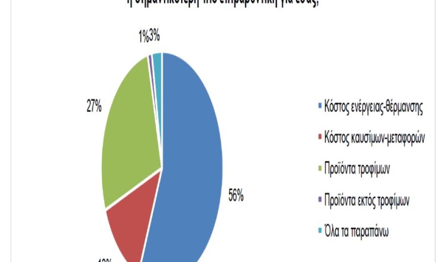 Εξειδικεύοντας τις κατηγορίες των ανατιμήσεων, φαίνεται ότι το κόστος ενέργειας και θέρμανσης είναι το πιο επιβαρυντικό για το κοινό σε ποσοστό 56% και ακολουθούν τα προϊόντα τροφίμων σε ποσοστό 27%, τα κόστη καυσίμων και μεταφορών με 13% και τέλος τα προϊόντα εκτός τροφίμων με μόλις 1%.
