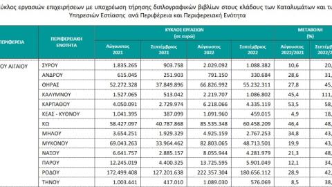 Για τις επιχειρήσεις στον κλάδο των καταλυμάτων, με υποχρέωση τήρησης διπλογραφικών βιβλίων, για τις οποίες υπάρχουν διαθέσιμα στοιχεία σε μηνιαία βάση, ο κύκλος εργασιών τον Σεπτέμβριο 2022 ανήλθε σε 1.141.961.800 ευρώ, σημειώνοντας αύξηση 36,3% σε σχέση με τον Σεπτέμβριο 2021, όπου είχε ανέλθει σε 837.649.666 ευρώ.