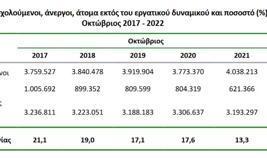Η Ελληνική Στατιστική Αρχή (ΕΛΣΤΑΤ) ανακοίνωσε τις εποχικά προσαρμοσμένες εκτιμήσεις απασχόλησης και ανεργίας για τον μήνα Οκτώβριο 2022.