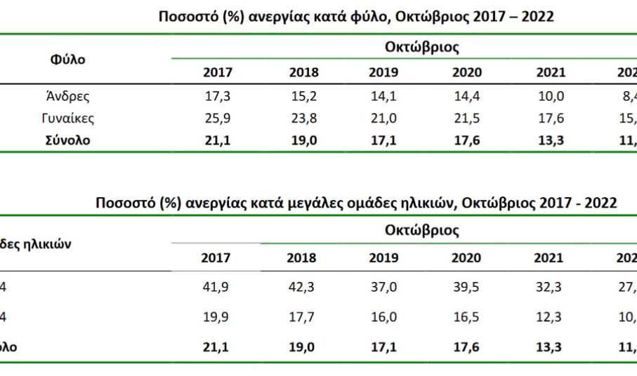 • Το εποχικά διορθωμένο ποσοστό ανεργίας τον Οκτώβριο του 2022 ανήλθε σε 11,6% έναντι του αναθεωρημένου προς τα κάτω 13,3% τον Οκτώβριο του 2021 και του αναθεωρημένου προς τα άνω 12,0% τον Σεπτέμβριο του 2022.