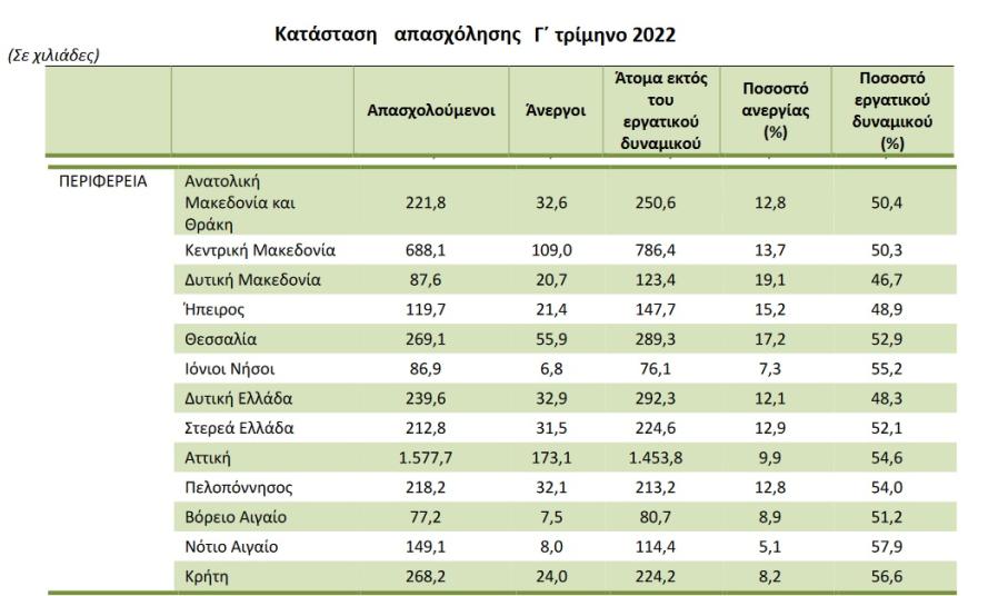 Ο αριθμός των ανέργων ανήλθε σε 555.567 άτομα, παρουσιάζοντας μείωση κατά 6,1% σε σχέση με το προηγούμενο τρίμηνο και μείωση κατά 9,7%, σε σχέση με το αντίστοιχο τρίμηνο του προηγούμενου έτους. Το ποσοστό ανεργίας το Γ΄ τρίμηνο 2022 ανήλθε σε 11,6%. Το ποσοστό ανεργίας κατά το προηγούμενο τρίμηνο (Β΄ 2022) ήταν 12,4% και κατά το αντίστοιχο τρίμηνο του προηγούμενου έτους (Γ΄ 2021) ήταν 13,0%.