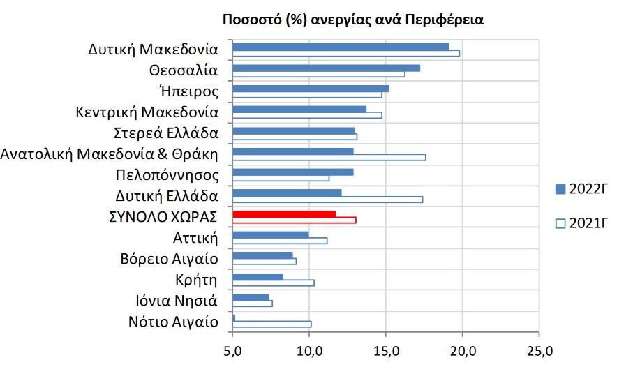 Τα υψηλότερα ποσοστά ανεργίας παρατηρούνται στις Περιφέρειες Δυτικής Μακεδονίας και Θεσσαλίας ενώ το χαμηλότερο στην Περιφέρεια Νοτίου Αιγαίου.
