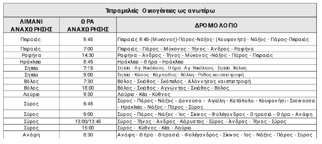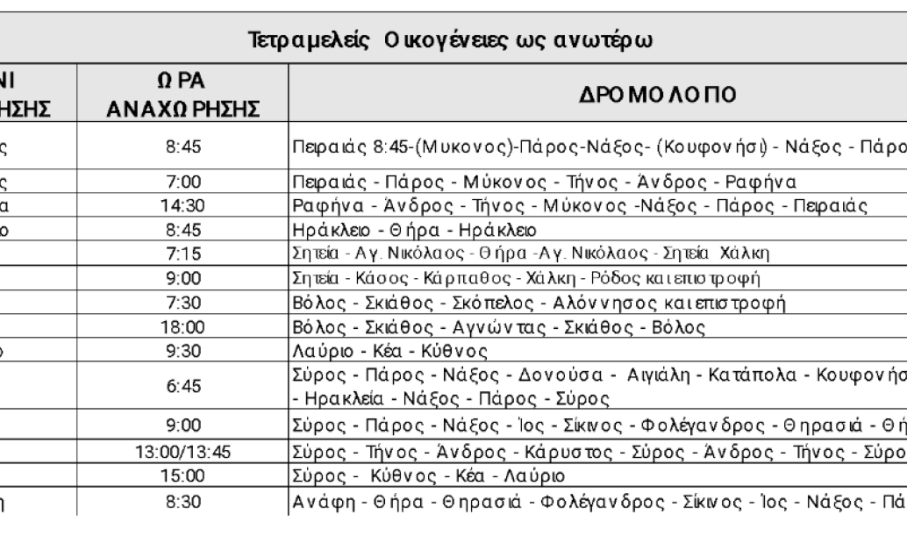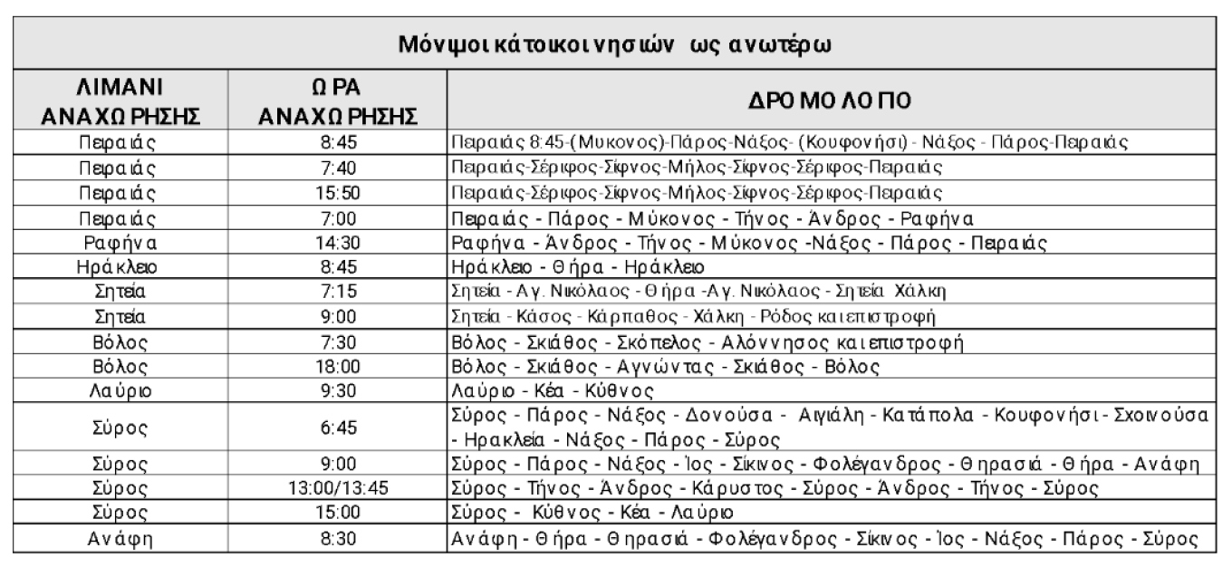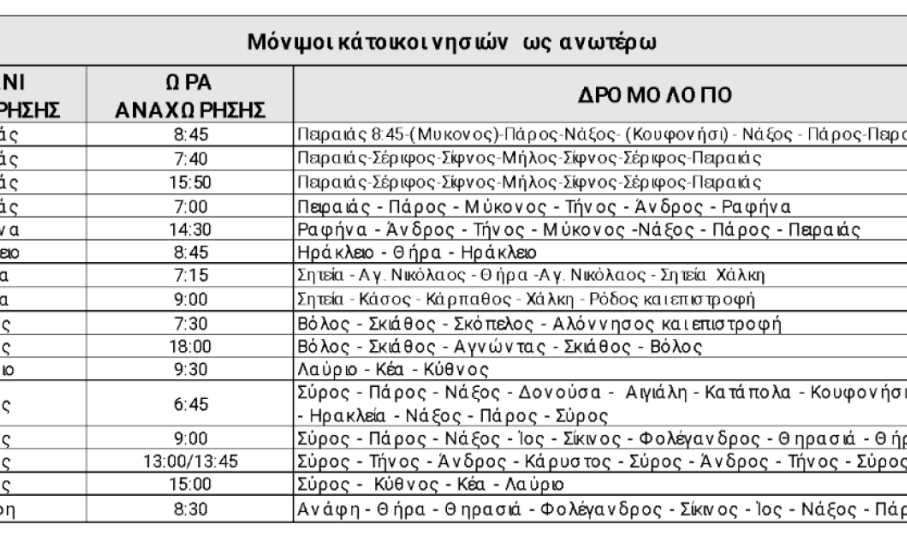 20% έκπτωση στα εισιτήρια επιβάτη σε όλα τα νησιά του Αιγαίου στα δρομολόγια όπως αναφέρονται στον παρακάτω πίνακα. (Για τους μόνιμους κατοίκους Δωδεκανήσων έκπτωση 40% στη γραμμή Σητεία – Δωδεκάνησα).