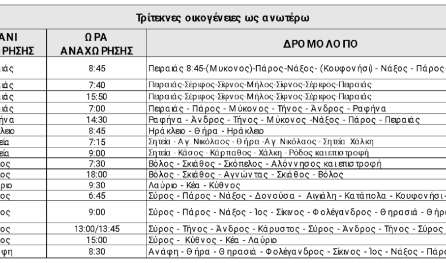 30% έκπτωση στα εισιτήρια επιστροφής επιβάτη για τους τρίτεκνους με την ταυτόχρονη έκδοση εισιτηρίων μετ’ επιστροφής στα δρομολόγια όπως αναφέρονται στον παρακάτω πίνακα. (Για τους πολύτεκνους ισχύει ήδη η έκπτωση 50%).