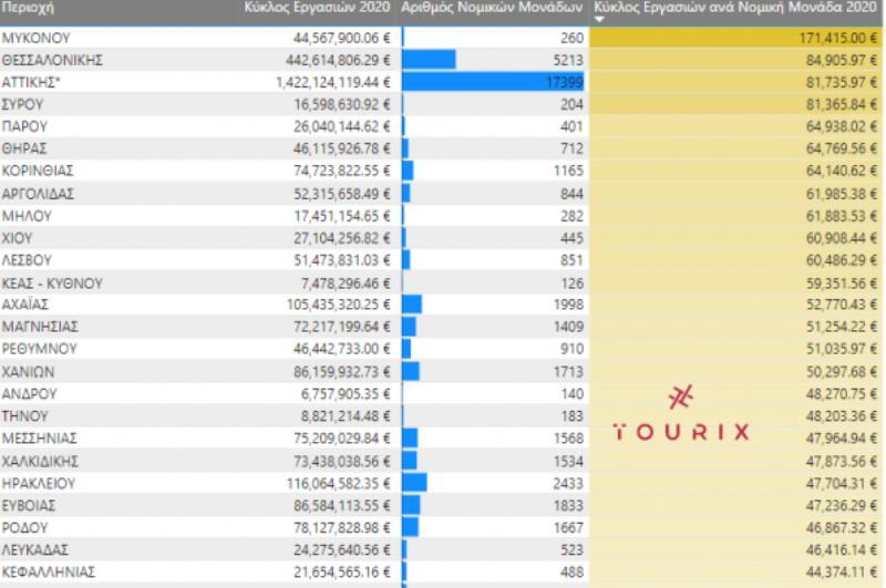 Παρά τον μικρό αριθμό επιχειρήσεων σε σχέση με άλλες μεγαλύτερες περιοχές, η έντονη δραστηριότητα ειδικότερα την θερινή σεζόν στην περιοχή της Μυκόνου, φέρνει το νησί στην πρώτη θέση όσον αφορά τις περιοχές στην Ελλάδα τον μέσο όρο τζίρου ανά επιχείρηση, που φτάνει περίπου τα 170 χιλιάδες ευρώ για όλο το έτος (2020). Ακολουθούν στη δεύτερη θέση η Θεσσαλονίκη με περίπου 85 χιλιάδες ευρώ ανά επιχείρηση και η Αττική με περίπου 82 χιλιάδες ευρώ ανά επιχείρηση. Η Σύρος φαίνεται επίσης υψηλά στην κατάταξη με περίπου 81 χιλιάδες ευρώ τζίρο ανά επιχείρηση.