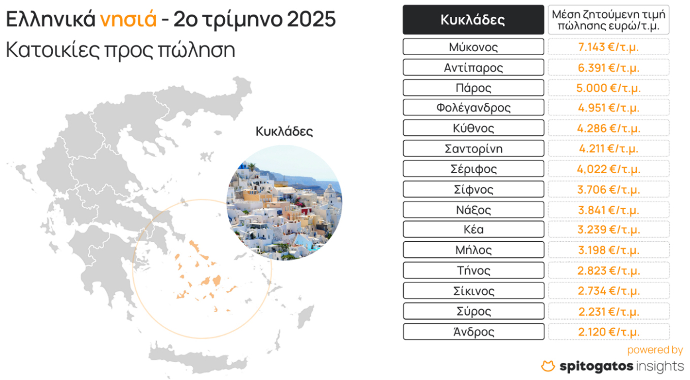 Τα νησιά των Κυκλάδων αποτελούν για πολλούς τον απόλυτο καλοκαιρινό προορισμό, καθώς προσφέρουν επιλογές που καλύπτουν κάθε προτίμηση, από την κοσμοπολίτικη Μύκονο μέχρι την εναλλακτική Αμοργό, Κατά το 2ο τρίμηνο του 2025, τα περισσότερα Κυκλαδονήσια καταγράφουν αυξήσεις στις ΜΖΤ πώλησης κατοικιών, με εξαίρεση τη Νάξο, τη Σέριφο και τη Σίκινο, όπου οι τιμές παραμένουν σχετικά σταθερές σε σύγκριση με την αντίστοιχη περίοδο του 2024.