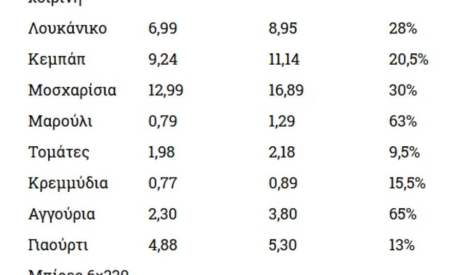 Οι τιμές σε πολλά είδη κρεάτων είναι από 1 έως και 4 ευρώ ακριβότερα. Σύμφωνα με τον πρόεδρο της Ένωσης Εργαζομένων Καταναλωτών Ελλάδας και μέλος της Διοίκησης της ΓΣΕΕ, Απόστολο Ραφτόπουλο, οι χοιρινές μπριζόλες πωλούνται στα 8 ευρώ αυξημένες κατά 8% σε σχέση με την αντίστοιχη περσινή περίοδο, ενώ οι τιμές στα λουκάνικα έχουν αυξηθεί κατά 28%, στο κεμπάπ κατά 20,5%, στην μοσχαρίσια μπριζόλα κατά 30%, στο μαρούλι κατά 63%, στις τομάτες κατά 9,5%, και στα αγγούρια κατά 65%.