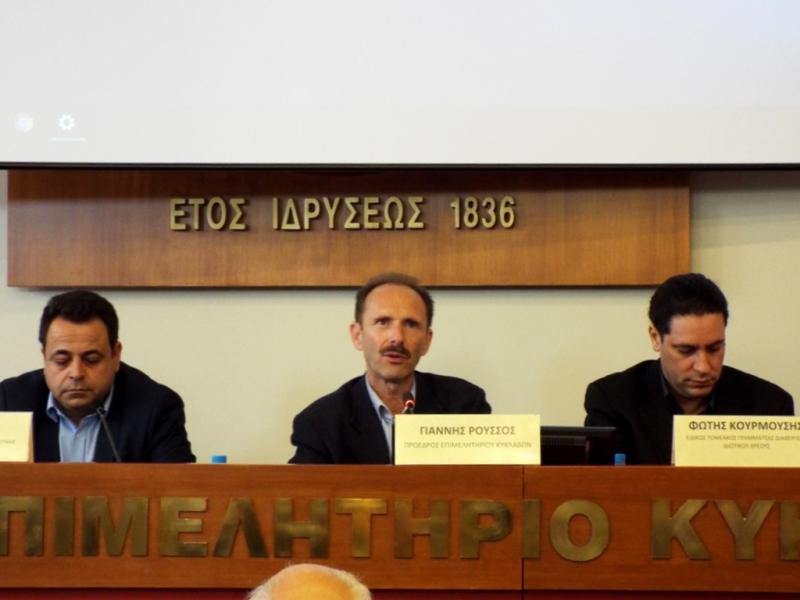 Στη συνέχεια, ο κ. Ρούσσος ενημέρωσε το κοινό της ημερίδας στα νησιά, πως της παρουσίας τους εκεί, προηγήθηκε συνάντηση στα γραφεία του Επιμελητηρίου Κυκλάδων, όπου συζητήθηκαν θέματα νησιωτικής πολιτικής.