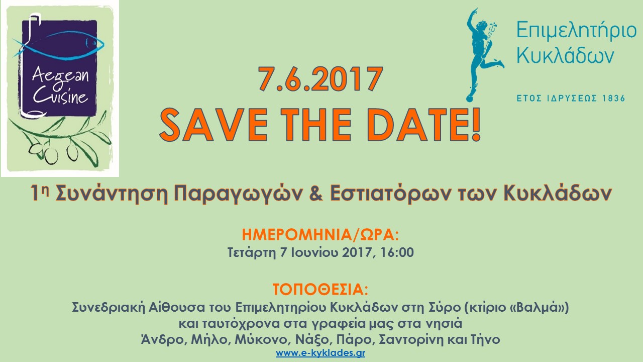 Την Τετάρτη 7 Ιουνίου και ώρα 16:00 θα πραγματοποιηθεί στη Συνεδριακή αίθουσα του Επιμελητηρίου Κυκλάδων στη Σύρο (κτίριο "Βαλμά") η 1η Συνάντηση Παραγωγών και Εστιατόρων των Κυκλάδων.