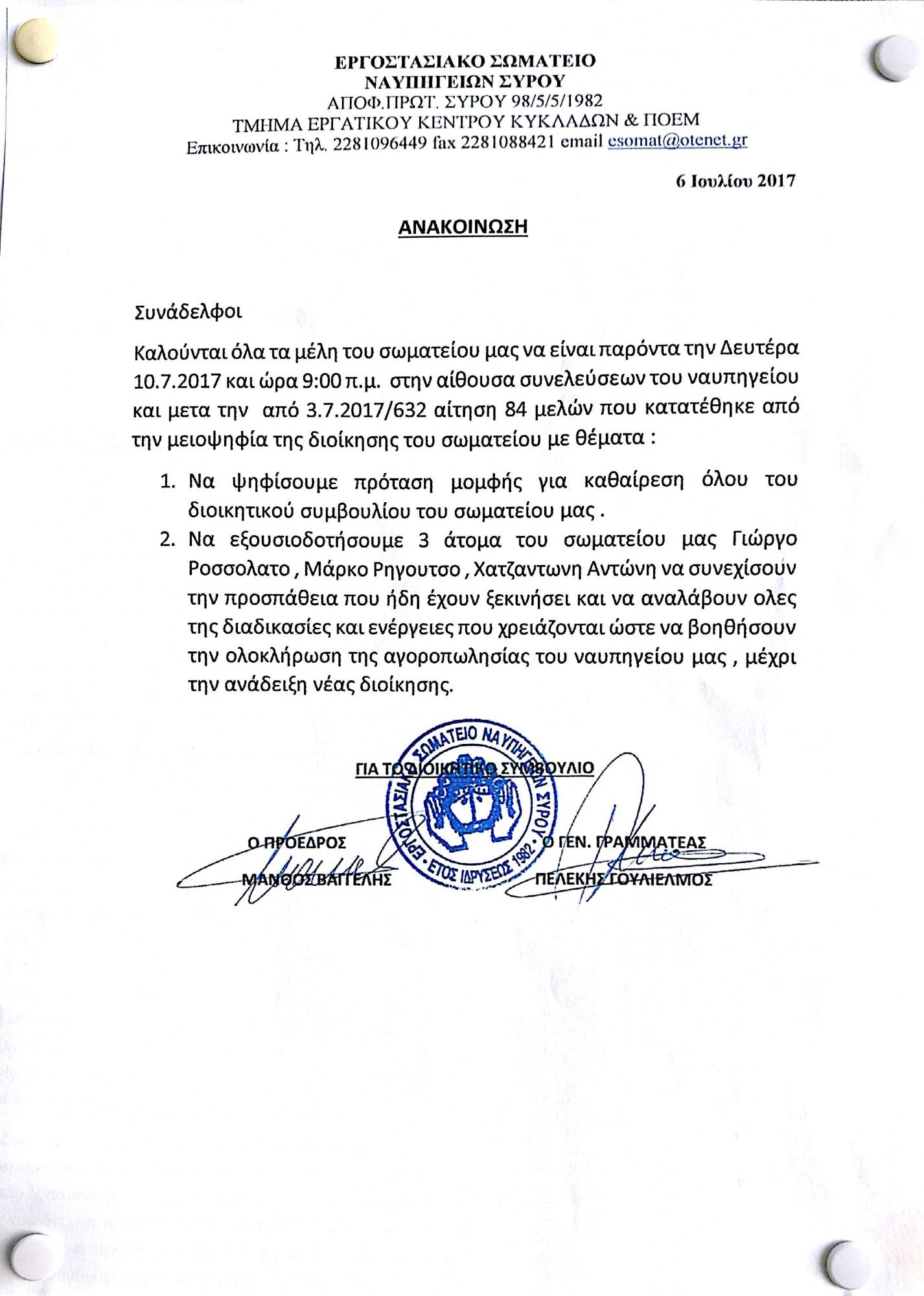 Το Σωματείο Εργαζομένων προέβη στην ανακοίνωση της διεξαγωγής της ίσως τελευταίας και σίγουρα σημαντικότερης, όσον αφορά στο μέλλον του ναυπηγείου, Γενικής Συνέλευσης των εργαζομένων, καθώς από τις αποφάσεις που θα ληφθούν, θα προκύψουν καθοριστικές εξελίξεις για το μέλλον του Νεωρίου.