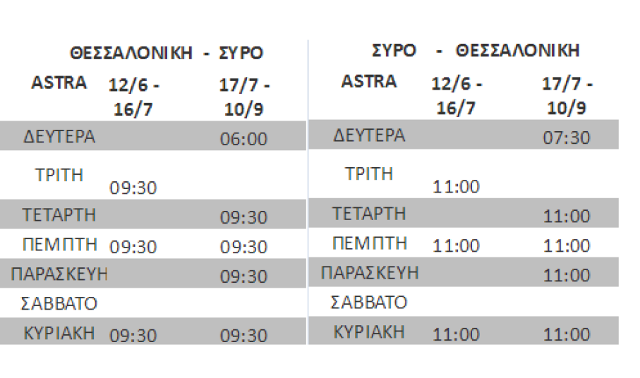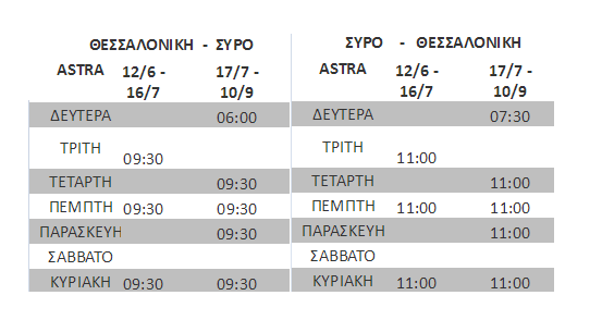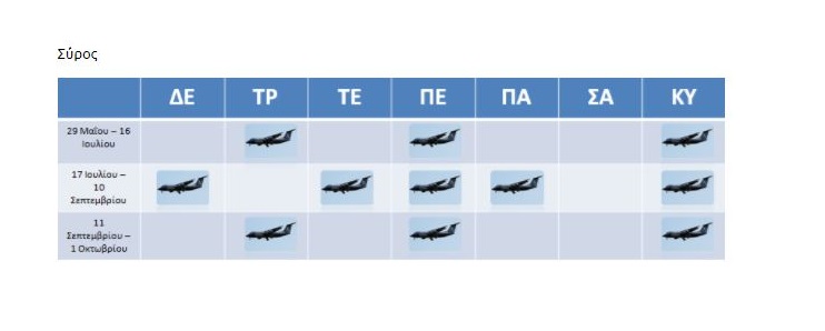 Όπως διαμορφώνονται, τα δρομολόγια της αεροπορικής εταιρίας Astra Airlines, από 17 Ιουλίου, η Σύρος θα συνδέεται με τη Θεσσαλονίκη, με πέντε πτήσεις κάθε Δευτέρα, Τετάρτη, Πέμπτη, Παρασκευή, Κυριακή.