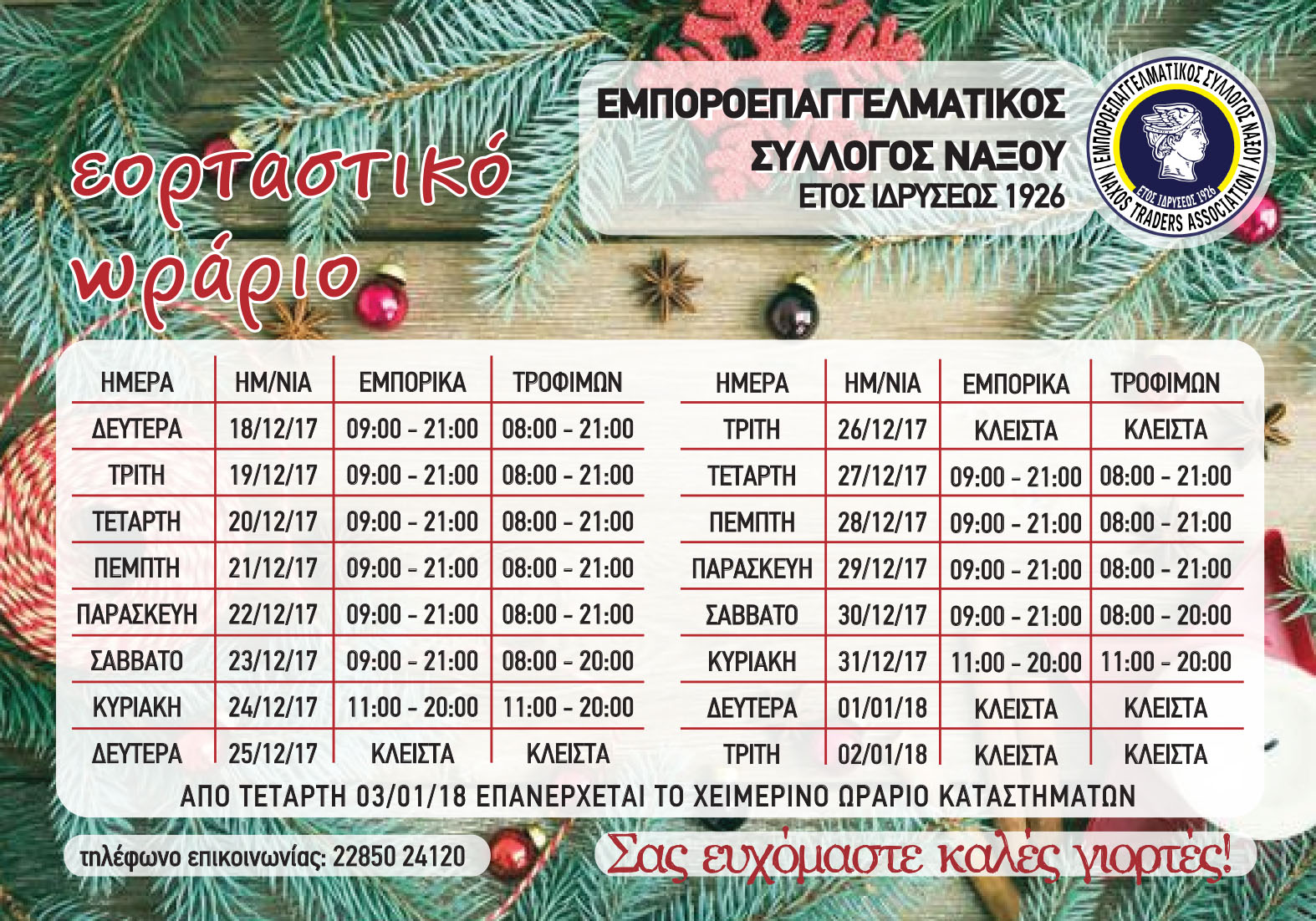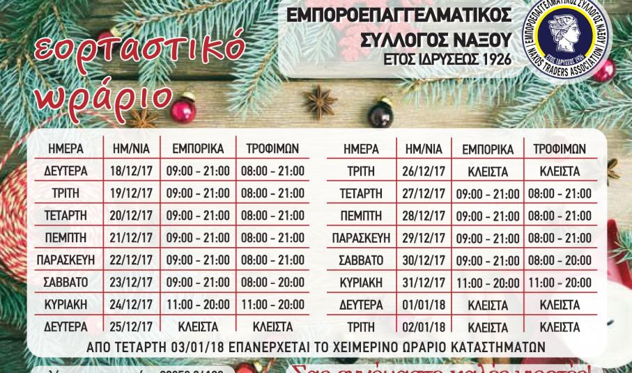To χειμερινό εορταστικό πρόγραμμα λειτουργίας των εμπορικών καταστημάτων στο νησί της Νάξου ανακοίνωσε ο Εμποροεπαγγελματικός Σύλλογος Νάξου.