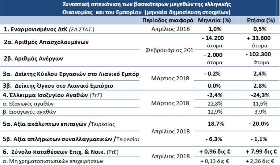 Αξιοσημείωτη ετήσια άνοδο κατέγραψαν οι πωλήσεις λιανικής τον προηγούμενο Μάρτιο, με τη μηνιαία οριακή τους υποχώρηση να αποδίδεται στο πέρας των γενικών χειμερινών εκπτώσεων, ενώ η θετική τους πορεία συνεχίζεται και στη διάρκεια του Ά Τριμήνου του 2018 (ετήσια σύγκριση). Ιδιαίτερα θετικά είναι τα μηνύματα που προκύπτουν από το ισοζύγιο αγαθών, καθώς η ετήσια και μηνιαία υποχώρηση του ελλείμματος προκύπτει τόσο από την αύξηση των εξαγωγών όσο και από την παράλληλη υποχώρηση των εισαγωγών. Η ικανοποίηση της συγκεκριμένης παραμέτρου συνιστά αναγκαία συνθήκη για την αναβάθμιση των ελληνικών προϊόντων και την ενίσχυση της εγχώριας παραγωγής. Από την άλλη πλευρά, η καταγεγραμμένη στασιμότητα του ποσοστού ανεργίας των τελευταίων μηνών επιβεβαιώνεται από την ταυτόχρονη μείωση του αριθμού των απασχολουμένων.