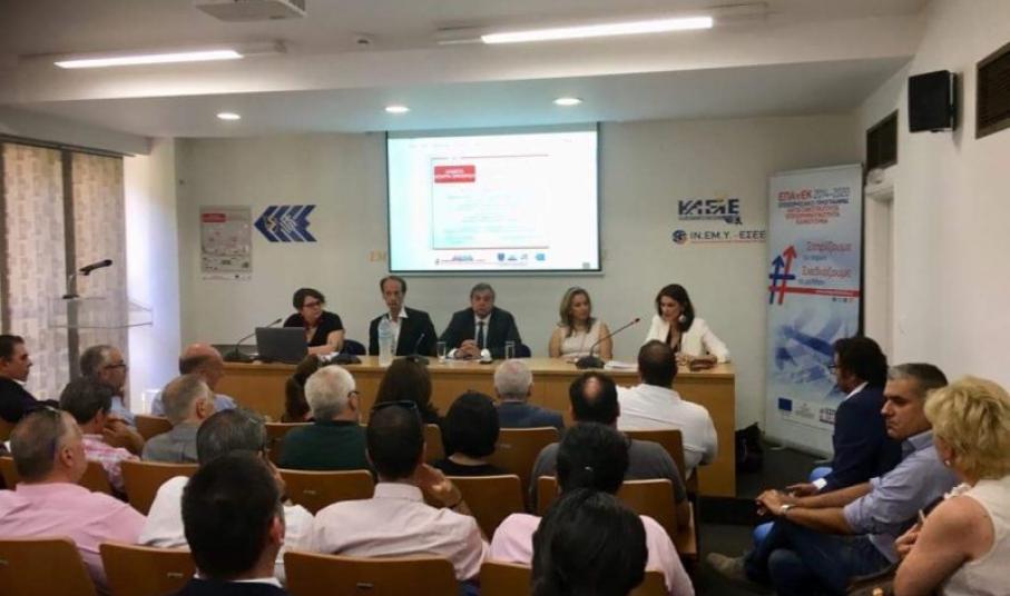 Πραγματοποιήθηκε στα γραφεία της Ε.Σ.Ε.Ε. ενημερωτική ημερίδα για το Πρόγραμμα «Ανοικτά Κέντρα Εμπορίου», που προκηρύχθηκε πρόσφατα από την Ειδική Υπηρεσία Διαχείρισης του Επιχειρησιακού Προγράμματος «Ανταγωνιστικότητα, Επιχειρηματικότητα και Καινοτομία». Στην εκδήλωση, στην οποία παρέστη η ΕΓ Διαχείρισης Τομεακών ΕΠ του ΕΤΠΑ και ΤΑ, κα. Ευγενία Φωτονιάτα, συμμετείχε πλήθος εκπροσώπων των Εμπορικών Συλλόγων, που αποτελούν δυνητικούς συνδικαιούχους των έργων του Προγράμματος.