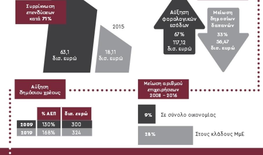 Σχεδόν τα 2/3 (67,47%) της συνολικής δημοσιονομικής προσαρμογής της δεκαετίας 2010–2019 ύψους 173,6 δισ. ευρώ προήλθε από το σκέλος των φορολογικών εσόδων. Έτσι, δημιουργήθηκε οξύτατο πρόβλημα επιβίωσης και ανταγωνιστικότητας για τις ελληνικές επιχειρήσεις.