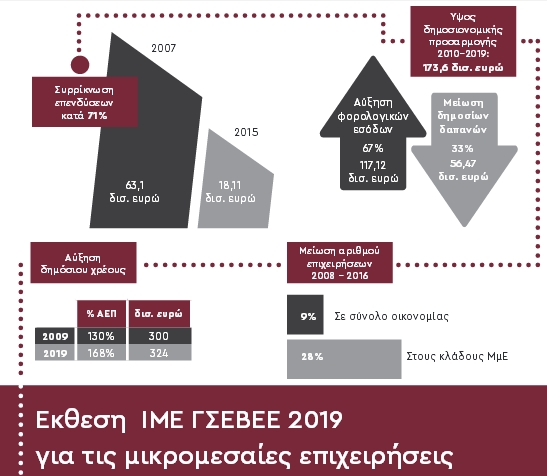 Η Έκθεση ΙΜΕ ΓΣΕΒΕΕ 2019 για τις μικρομεσαίες επιχειρήσεις αποτελεί ένα είδους απολογισμού των δέκα και πλέον ετών που έχουν παρέλθει από την εκδήλωση της κρίσης και της πολιτικής της εσωτερικής υποτίμησης. Βασική επιδίωξη της έκθεσης είναι η αποτύπωση του περιβάλλοντος μέσα στο οποίο δραστηριοποιούνται οι ελληνικές μικρομεσαίες επιχειρήσεις και η ανάδειξη των διαρθρωτικών μεταβολών της επιχειρηματικότητας στην Ελλάδα κατά τη διάρκεια της κρίσης. Ιδιαίτερη έμφαση δίνεται στα προβλήματα ρευστότητας και άντλησης χρηματοδότησης, που σε συνδυασμό με την υψηλή φορολογία αναδεικνύονται ως τα σημαντικότερα εμπόδια για τις μικρομεσαίες επιχειρήσεις στην Ελλάδα σήμερα.