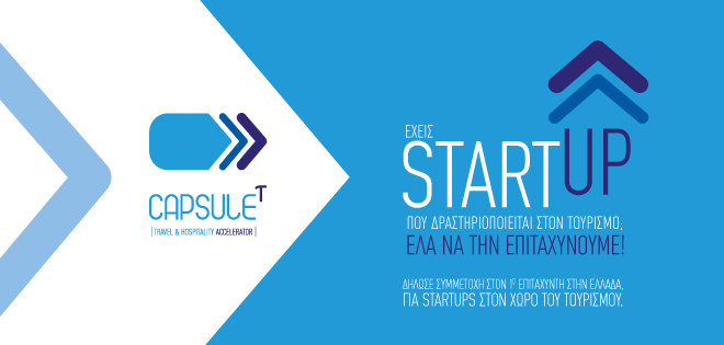 Άνοιξε η περίοδος αιτήσεων για την ένταξη startups στον CapsuleT Travel & Hospitality Accelerator του Ξενοδοχειακού Επιμελητηρίου της Ελλάδος, του πρώτου ελληνικού επιταχυντή αποκλειστικά για τεχνολογικές νεοφυείς επιχειρήσεις στον τομέα του τουρισμού.