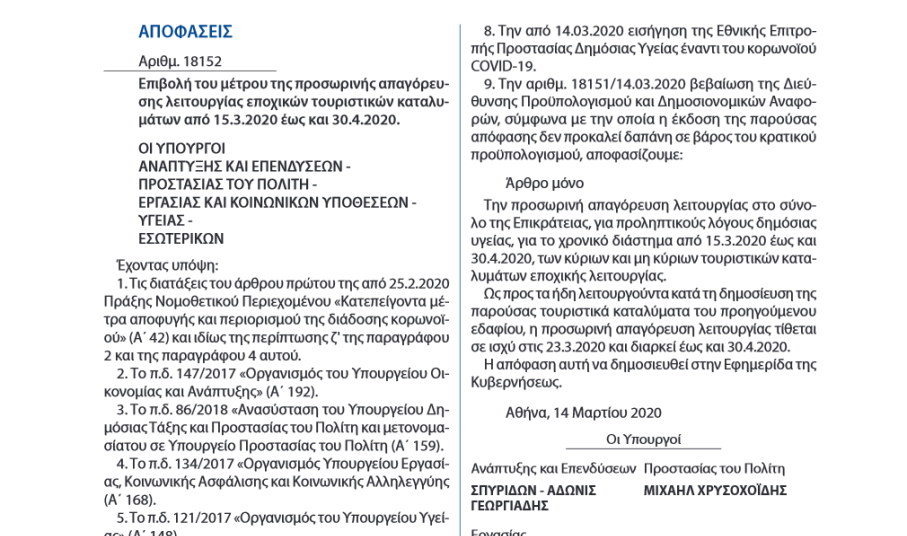 Την προσωρινή απαγόρευση λειτουργίας στο σύνολο της Επικράτειας, για προληπτικούς λόγους δημόσιας υγείας, για το χρονικό διάστημα από 15.3.2020 έως και 30.4.2020, των κύριων και μη κύριων τουριστικών καταλυμάτων εποχικής λειτουργίας.