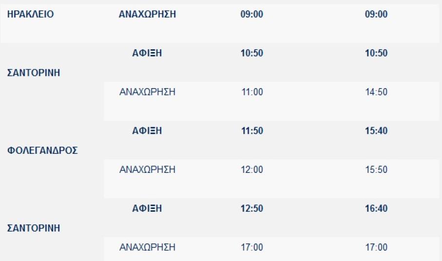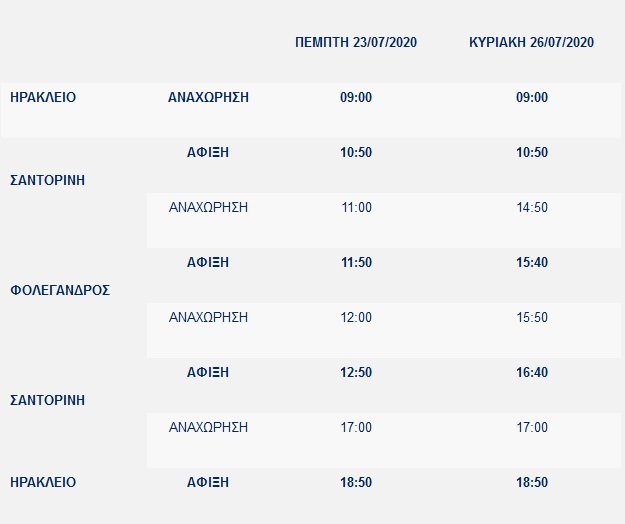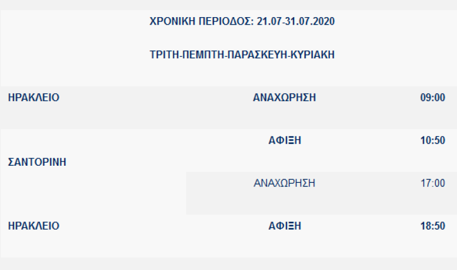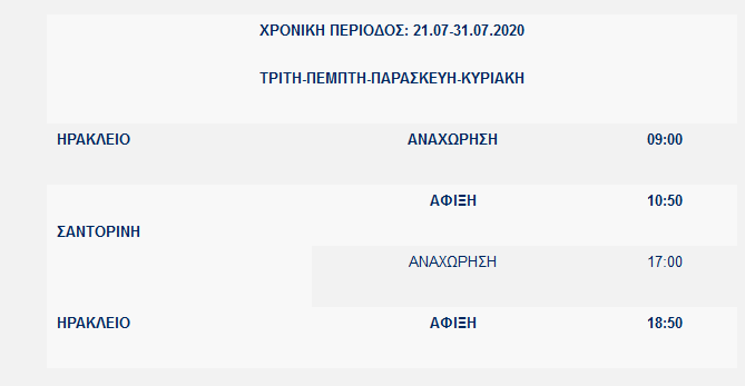 Κατά τη διάρκεια της χρονικής περιόδου 21/07/2020 – 31/07/2020, το πλοίο θα εκτελεί τη γραμμή ΗΡΑΚΛΕΙΟ – ΣΑΝΤΟΡΙΝΗ –ΗΡΑΚΛΕΙΟ, κάθε Τρίτη, Πέμπτη, Παρασκευή και Κυριακή και ώρες αναχωρήσεων/αφίξεων ως ακολούθως: