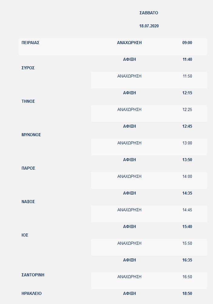 Το Σάββατο 18 Ιουλίου 2020, το υπερσύγχρονο High Speed Catamaran SANTORINI PALACE θα πραγματοποιήσει το δρομολόγιό του με αναχώρηση από το λιμάνι του Πειραιά και με τελικό προορισμό το λιμάνι του Ηρακλείου, εκτελώντας τη γραμμή Πειραιάς-Σύρος-Τήνος-Μύκονος-Πάρος-Νάξος-Ίος-Σαντορίνη-Ηράκλειο, σύμφωνα με το παρακάτω πρόγραμμα: