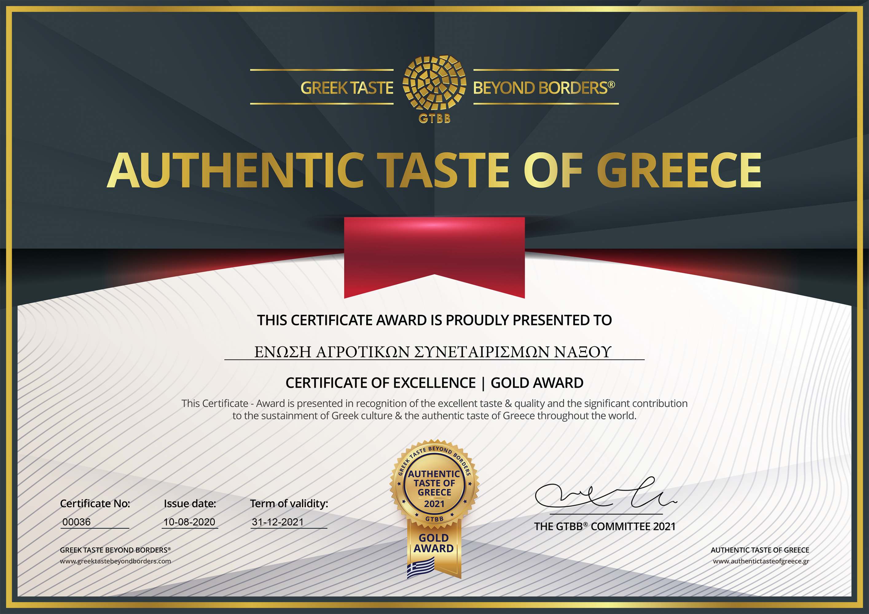 Ο οργανισμός Greek Taste Beyond Borders (GTBB), ο οποίος αναδεικνύει την Ελλάδα και τα προϊόντα της σε όλο τον πλανήτη μέσω του πληρέστερου και πιο επιτυχημένου παγκόσμιου business network, πιστοποίησε/βράβευσε την «Ένωση» με το σήμα ποιότητας-βραβείο Αυθεντικής Ελληνικής Γεύσης – Authentic Taste of Greece Gold Award 2020 & 2021, για τον πρωταγωνιστικό της ρόλο στην ανάπτυξη της αγροτικής παραγωγής και την στήριξη της τοπικής οικονομίας.