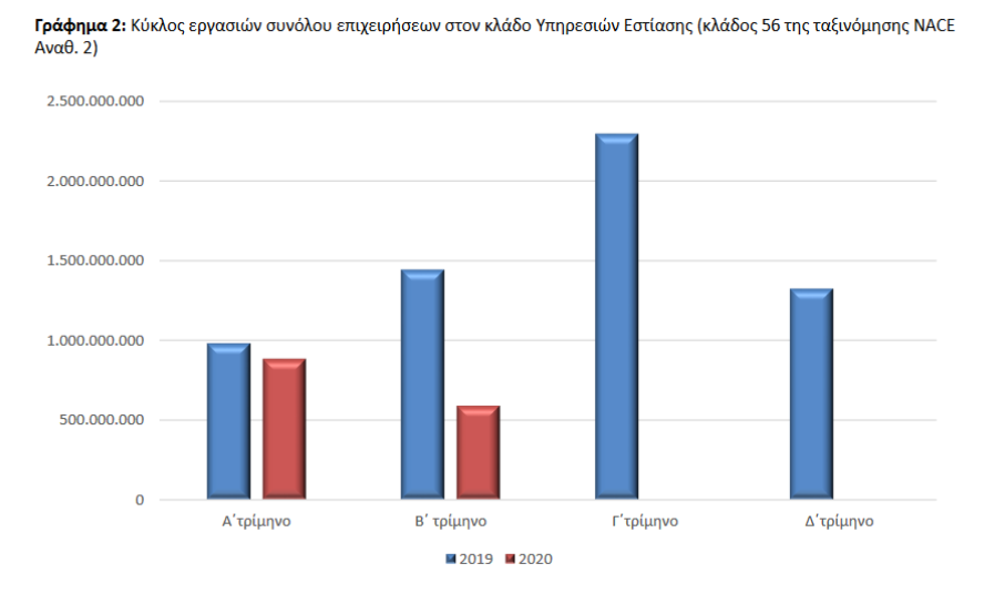 Στο σύνολο των επιχειρήσεων του κλάδου υπηρεσιών εστίασης, ο κύκλος εργασιών το δεύτερο τρίμηνο του 2020 ανήλθε σε 592.729.473 ευρώ, σημειώνοντας μείωση 59,0% σε σχέση με το δεύτερο τρίμηνο του 2019, όπου είχε ανέλθει σε 1.446.782.662 ευρώ. Η μεγαλύτερη μείωση στον κύκλο εργασιών για το β’ τρίμηνο 2020 σε σύγκριση με το αντίστοιχο περσινό διάστημα παρατηρήθηκε στην Περιφερειακή Ενότητα Θήρας (95,6%), ενώ η μικρότερη μείωση (33,3%) καταγράφηκε στην Περιφερειακή Ενότητα Γρεβενών.
