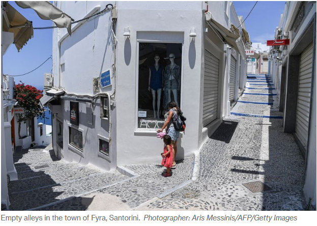 Το Bloomberg φιλοξενεί δηλώσεις του Μανώλη Καραμολέγκου, ιδιοκτήτη του Meltemi Hotels and Resorts στην Σαντορίνη και πρόεδρο του Συλλόγου Ξενοδόχων Θήρας. Όπως αναφέρει ο κ. Καραμολέγκος, «πρέπει να προετοιμαστούμε χωρίς να γνωρίζουμε αν καν θα λειτουργήσουμε. Δεν μπορούμε να αφήσουμε τις ετοιμασίες για την τελευταία στιγμή».