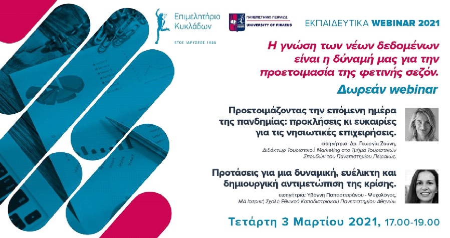 Ο νέος εκπαιδευτικός κύκλος ξεκινά με ένα ΔΩΡΕΑΝ webinar με θέμα «Η γνώση των νέων δεδομένων είναι η δύναμή μας για την προετοιμασία της φετινής σεζόν» που απευθύνεται σε κάθε ενδιαφερόμενο, που δραστηριοποιείται στις Κυκλάδες και είναι μέλος του Επιμελητηρίου Κυκλάδων.