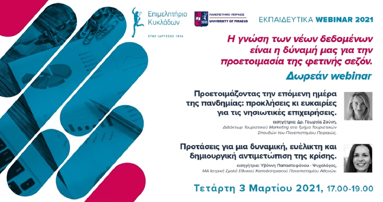 Την Τετάρτη 3 Μαρτίου 2021, ώρες 17.00-19.00 θα πραγματοποιηθεί το πρώτο ΔΩΡΕΑΝ webinar με θέμα «Η γνώση των νέων δεδομένων είναι η δύναμή μας για την προετοιμασία της φετινής σεζόν», με το οποίο ξεκινά ο νέος εκπαιδευτικός κύκλος σπουδών που διοργανώνει το Επιμελητήριο Κυκλάδων σε συνεργασία με το Πανεπιστήμιο Πειραιώς.