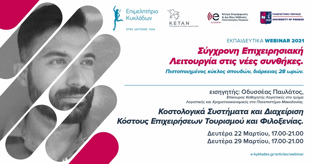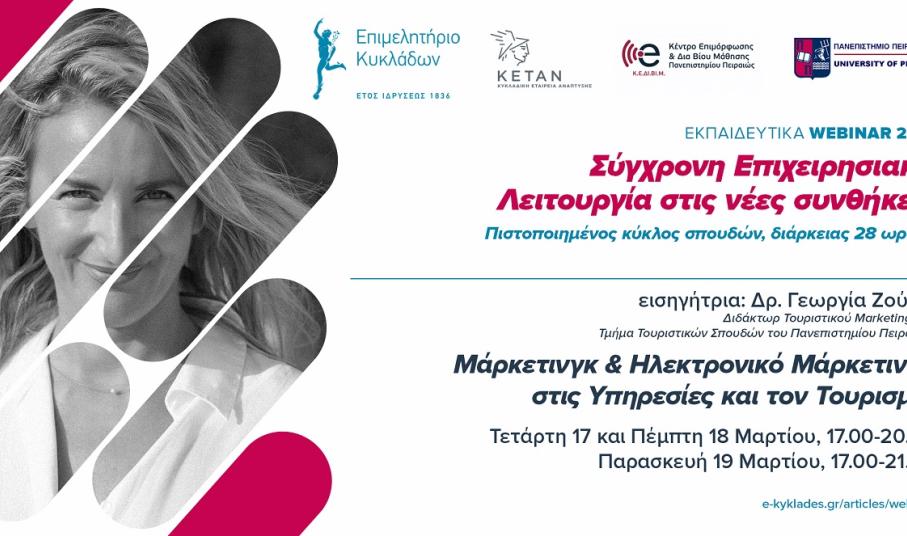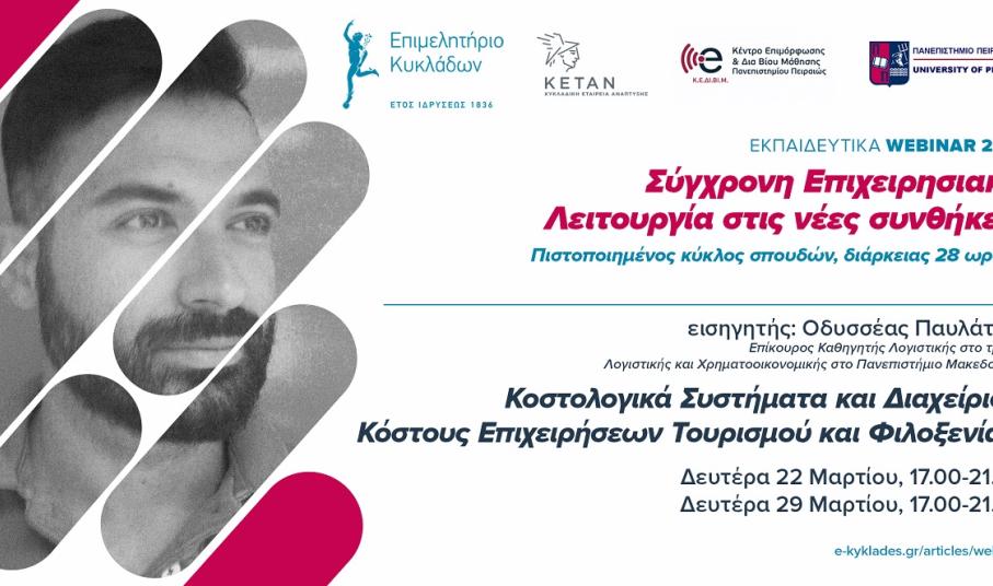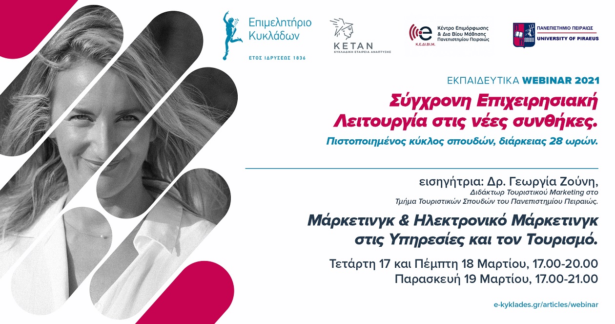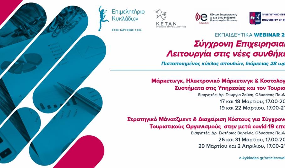 Με την πεποίθηση ότι η γνώση των νέων δεδομένων είναι δύναμή μας, το Επιμελητήριο Κυκλάδων ξεκινά δυναμικά την προετοιμασία των μελών του εν όψει της νέας τουριστικής σεζόν με έναν νέο πιστοποιημένο κύκλο σπουδών, ειδικά διαμορφωμένο για τις ανάγκες των επιχειρήσεων στις Κυκλάδες την εποχή της πανδημίας, σε συνεργασία με το Κέντρο Επιμόρφωσης & Διά Βίου Μάθησης του Πανεπιστημίου Πειραιώς, την Τετάρτη 17 Μαρτίου 2021. Στόχος είναι να προσφέρει στα μέλη του έγκυρη ενημέρωση και να συμβάλει στην αναβάθμιση των γνώσεων και των δεξιοτήτων τους προκειμένου να ανταπεξέλθουν στις νέες συνθήκες που έχει διαμορφώσει η πανδημία και τις αλλαγές στις τάσεις, τις ανάγκες και τις προοπτικές του Τουρισμού, που αποτελεί τη βασική επιχειρηματική δραστηριότητα των νησιών μας.