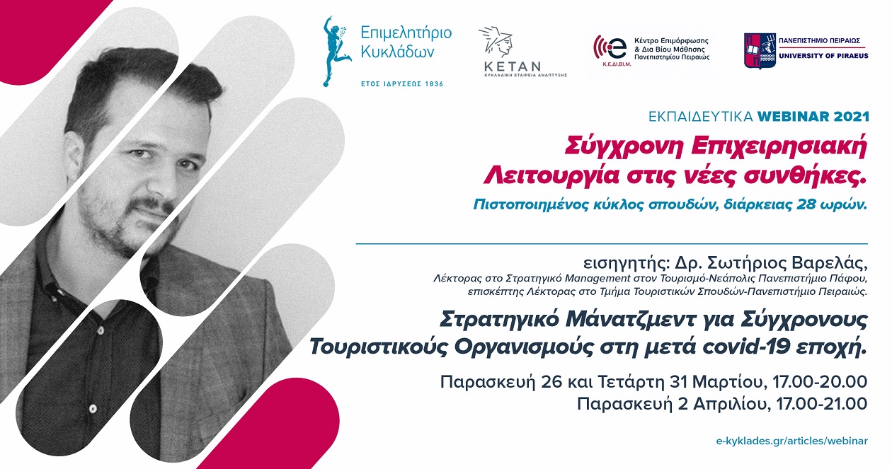 Στρατηγικό Μάνατζμεντ για Σύγχρονους Τουριστικούς Οργανισμούς στη μετά covid-19 εποχή ο Δρ. Σωτήριος Βαρελάς, Λέκτορας στο Στρατηγικό Management στον Τουρισμό-Νεάπολις Πανεπιστήμιο Πάφου, επισκέπτης Λέκτορας στο Τμήμα Τουριστικών Σπουδών-Πανεπιστήμιο Πειραιώς.